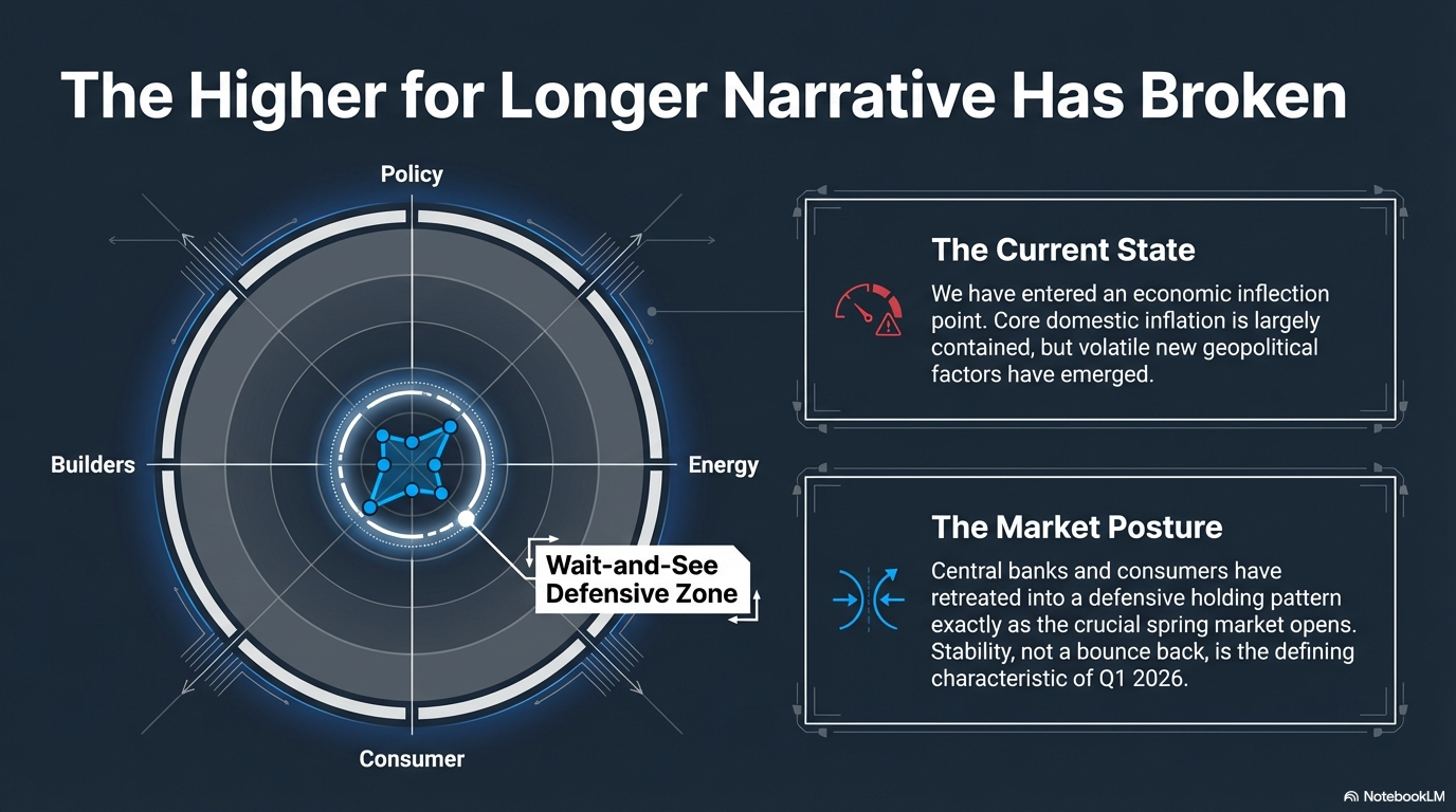 We are currently navigating an economic inflection point. The narrative of "higher for longer" that dominated 2024 and much of 2025 has been replaced. While the core inflationary threat has been largely contained, new, volatile factors have emerged, particularly in geopolitics and energy, forcing central banks into a defensive "wait-and-see" posture just as the crucial spring market opens.