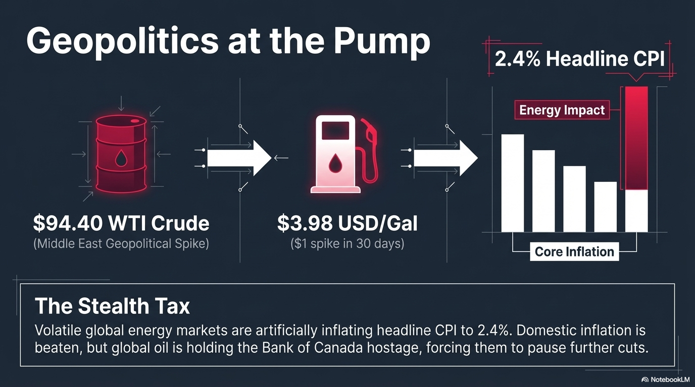 This energy spike acts as a "stealth tax" on consumers and forces the BoC to hold rates at 2.25% to manage headline inflation, even as the rest of the domestic economy is in stagnation.